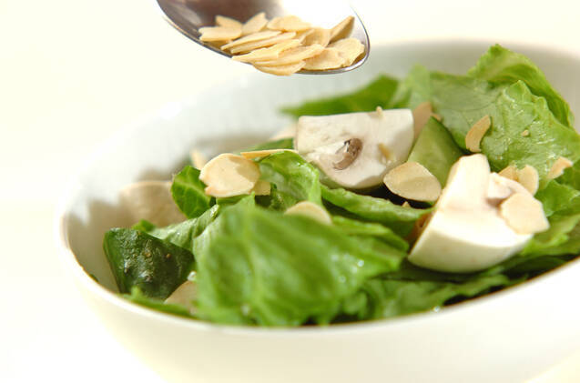 器にマッシュルーム、サニーレタス、キュウリを盛り、スライスアーモンドを散らす。食べる直前に、<ドレッシング>の材料をかける。