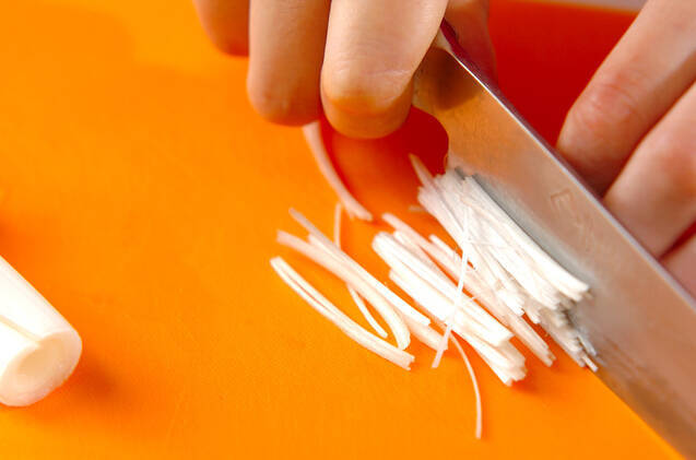 白ネギは長さ3cmに切り、縦に中央まで切り込みを入れて1枚に広げ、縦にせん切りにして水に放つ(白髪ネギ)。シャキッとしたらザルに上げ、キッチンペーパーなどで水気を拭き取る。