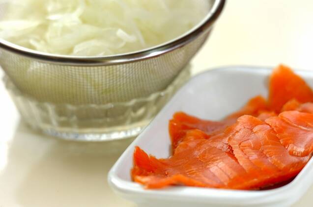 新玉ネギは皮をむき、縦半分に切り、縦に薄切りにする。