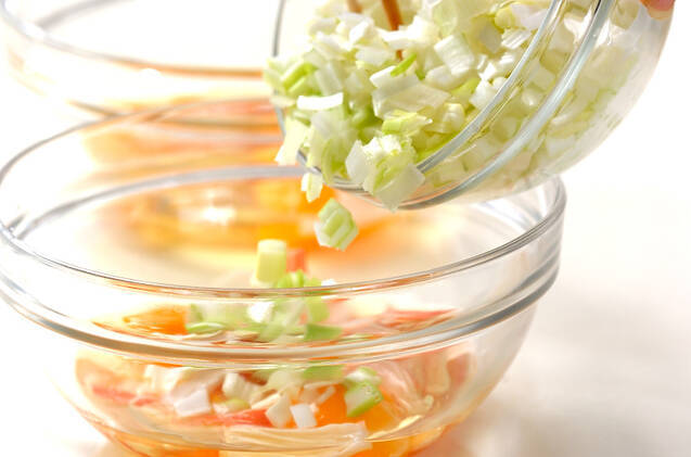 ボウルに1人分ずつ、卵2個を割りほぐし、カニ風味カマボコ、粗いみじん切りの白ネギを加えてサッと混ぜ合わせる。