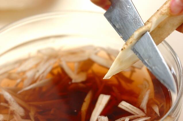 ゴボウはタワシでこすって水洗いし、細かなささがきにして水に放ち、水気をきってしっかり水気を拭き取る。揚げ油を180℃に熱する。