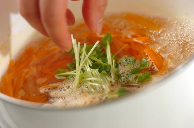 鍋にだし汁と大根、ニンジン、シイタケを入れて中火にかける。大根が透明になったら、貝われ菜を加え、<調味料>の材料を加えて塩で味を調え、器に注ぐ。
