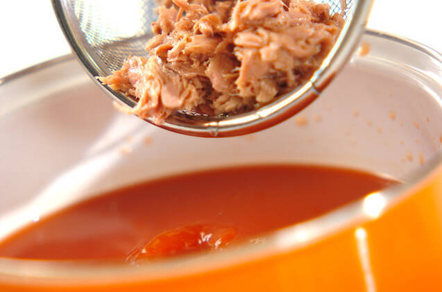 鍋に<スープ>の材料、ニンジン、ツナを入れて火にかけ、煮たったら中火で5~6分煮る。