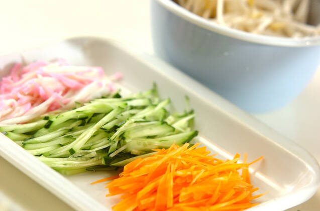 モヤシはできれば根を取り、水に放ってシャキッとしたらザルに上げ、水気をきる。