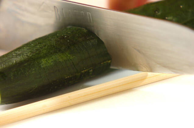 キュウリは両端を切り落として菜ばしではさみ、お箸に当たる深さまで斜めに細かく切り込みを入れる。キュウリを返して同様に切り込みを入れ、幅2cmに切り分けて塩水につけ、しんなりさせる。