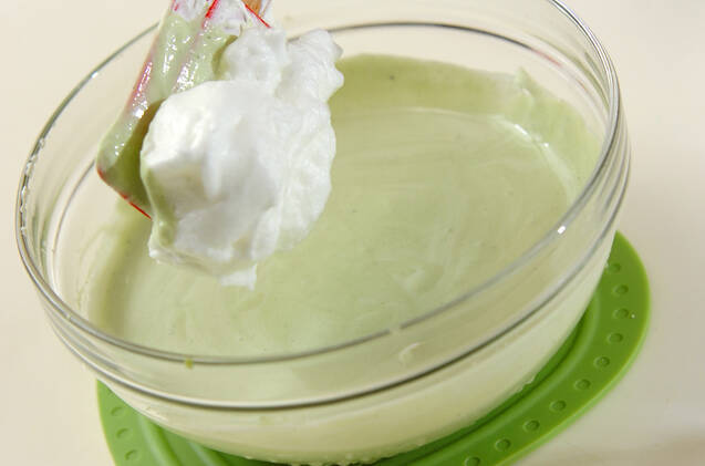 (2)に(3)を加えて混ぜ、さらに(4)を加えて混ぜ合わせる。器に流し入れ、冷蔵庫で冷やしかためる。
