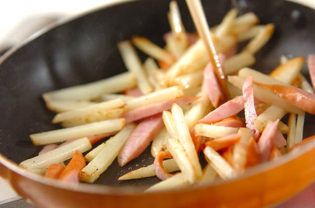 フラパンにサラダ油と新ジャガイモを入れ、強めの中火で炒め、塩コショウを振る。さらにソーセージを加えて炒め合わせ、最後にケチャップを加えて全体にからめる。