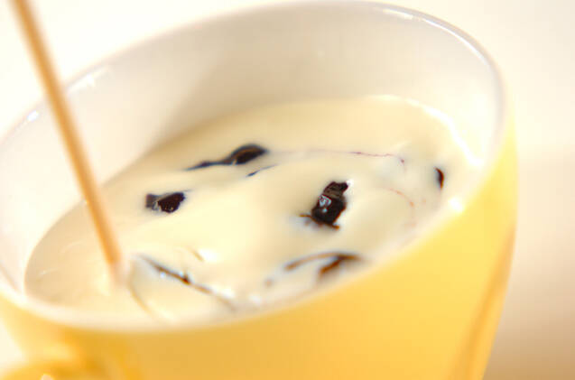 ふやかしたゼラチンを電子レンジで10~20秒程加熱して溶かし、(1)に加えて混ぜ合わせ、器に流し入れる。ブルーベリージャムを加えて竹串などで混ぜ、マーブル状になったら冷蔵庫で冷やし固める。固まったら、ミントの葉を飾る。