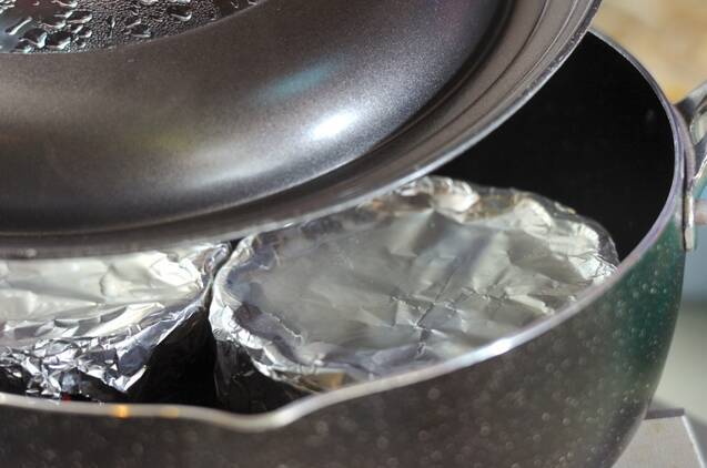(3)が沸騰したら火を弱め、15~20分弱火で蒸す。火を止め、粗熱が取れたら冷蔵庫に入れ、食べる直前まで冷やす。