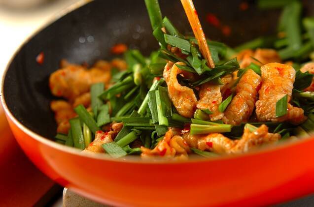 豚バラ肉に火が通ったらニラ、酒、みりん、しょうゆを加えて絡めながら炒める。