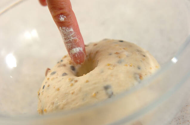 指に分量外の強力粉をつけてパンに穴をあけ、そのままの穴が残るか確認をする(フィンガーテスト)。ガス抜きをして丸めなおし、ベンチタイム10分。