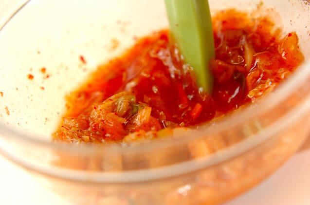 <ドレッシング>のボウルに、白菜キムチを加えて混ぜ合わせる。漬け汁があれば一緒に混ぜ合わせる。