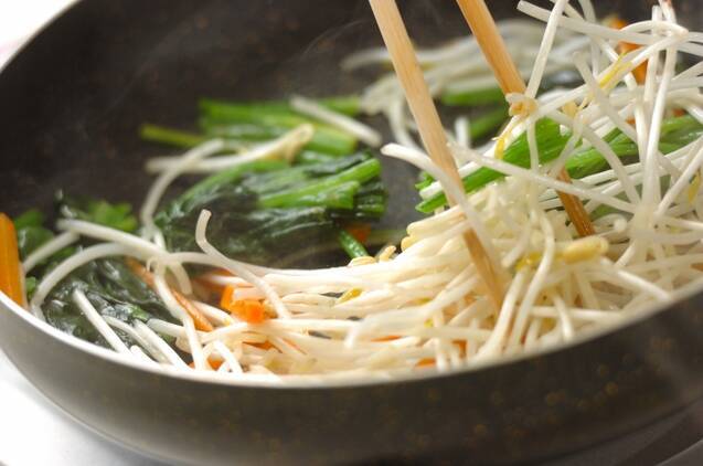 フライパンにサラダ油を中火で熱し、ニンジンを炒める。全体に炒められたらモヤシとホウレン草を加え、サッと炒め合わせていったん取り出す。