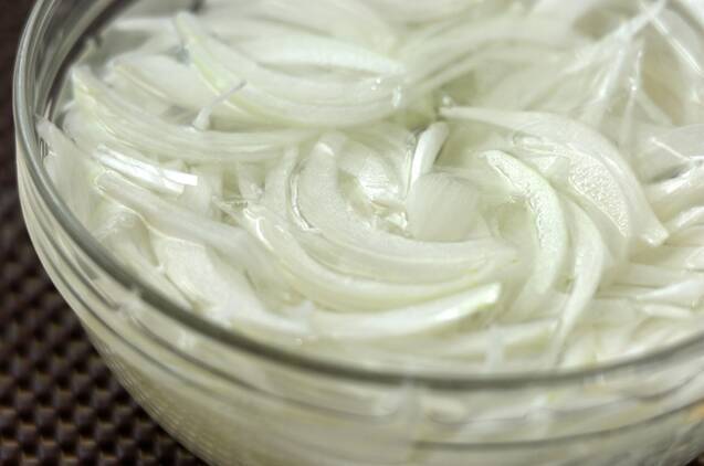 新玉ネギは薄切りにして水にさらし、ザルに上げて水気をきる。大葉は軸を切り落とし、丸めてせん切りにする。梅干しは刻んで<梅肉ソース>の材料を混ぜ合わせる。