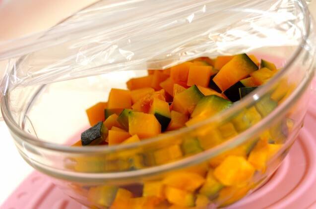 カボチャは種とワタを取って1cm角に切り、耐熱皿に並べてラップをし、電子レンジで3~4分加熱する。