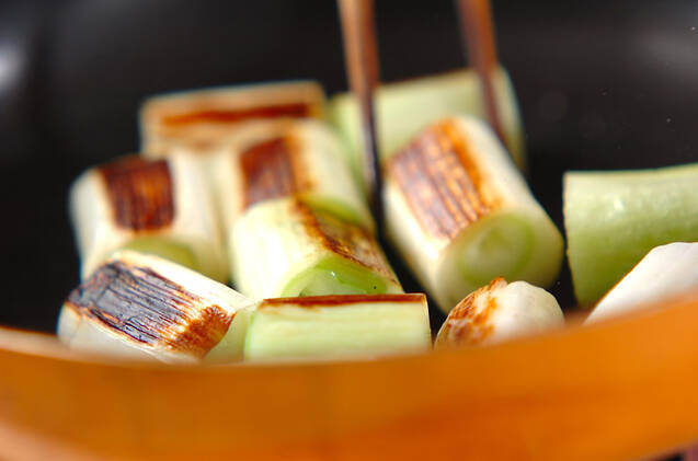 白ネギは長さ2~3cmに切り、フライパンに分量外のサラダ油をひき、薄く焼き色がつくまで焼く。