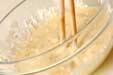 <衣>を混ぜる。ボウルに卵を割り、冷水を加え混ぜ合わせ、小麦粉、上新粉を加えさっくり、粉が少し残る程度に混ぜ合わせる。
