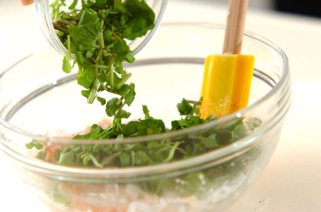 <調味料>のボウルに糸コンニャクとクレソンを加え、軽く混ぜる。器に盛り、白ゴマを散らす。