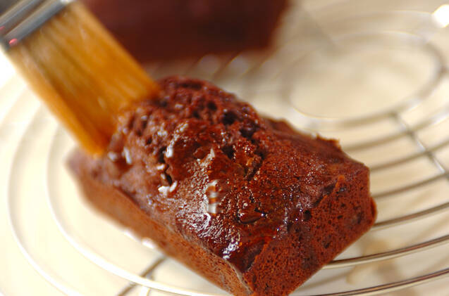 粗熱が取れたら<シロップ>をぬり、<デコレーション>のオレンジスティックを飾り、粉糖を振ってでき上がり。
