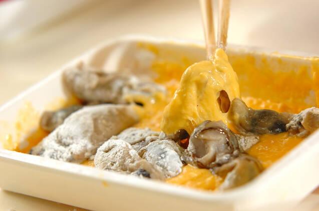溶き卵に残った小麦粉を加え、水を加えて混ぜ合わせる。指をつけて持ち上げたら、全体にポッテリからまる位のかたさに混ぜ合わせて生カキをつけ、パン粉をからめる。