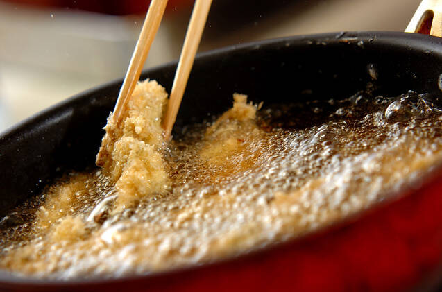 170℃の揚げ油にエビを入れ、カリッと色よく揚げる。揚げ油の温度を180℃に上げて生カキを入れ、サクッと揚げる。