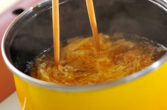 溶き卵を加え、菜ばしで大きく円を描くように混ぜ合わせる。卵がふんわり浮かんできたら火を止め、器に注ぐ。