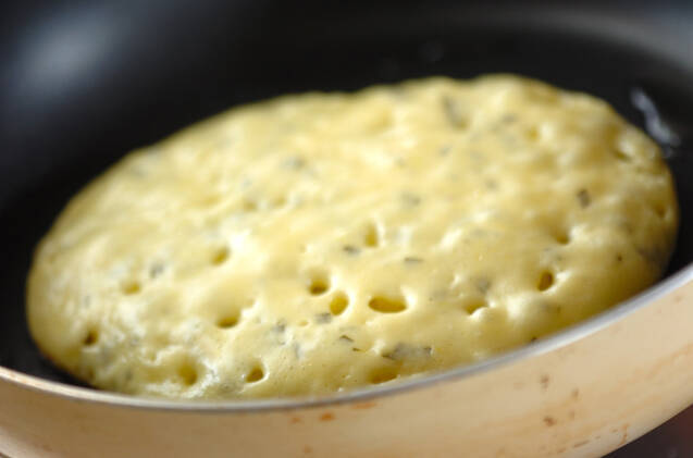 フライパンにサラダ油を薄く熱して、合わせた<パンケーキ生地>の1/4量ずつ流し込み、弱火にしてプツプツ泡が出てきたら、ひっくり返して焼き色がつくまで焼く。