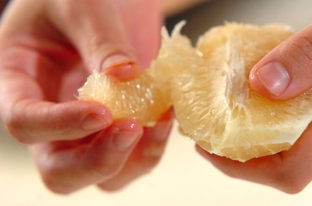 グレープフルーツは包丁で皮をむき、1房ずつ取り出す。