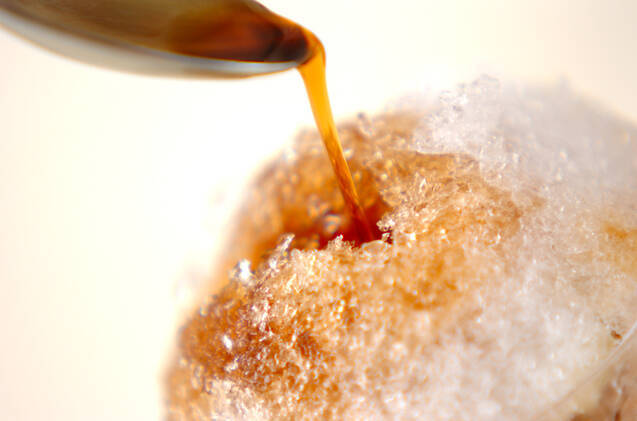濃いめのコーヒーをかけて刻みパイナップルを入れ、沈んだ分カキ氷を入れてコーヒーリキュールを掛ける。薄い板チョコを立てて金粉をのせる。