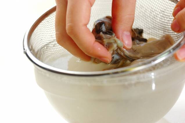 生カキは<水溶き片栗>に浸し、手でやさしくもみながら洗う。黒い水が出なくなるまで水をかえて洗い、水気を拭いて全体に小麦粉をまぶす。卵は溶きほぐし、塩を加えて混ぜる。