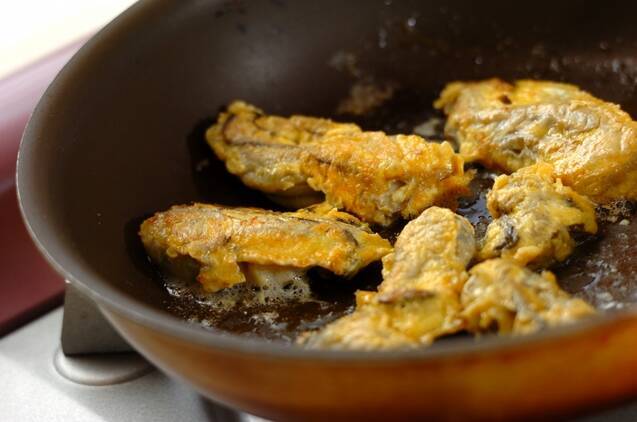 フライパンにゴマ油を温め、生カキを溶き卵にくぐらせて、フライパンに並べる。弱火で約2~3分ずつ両面を焼く。