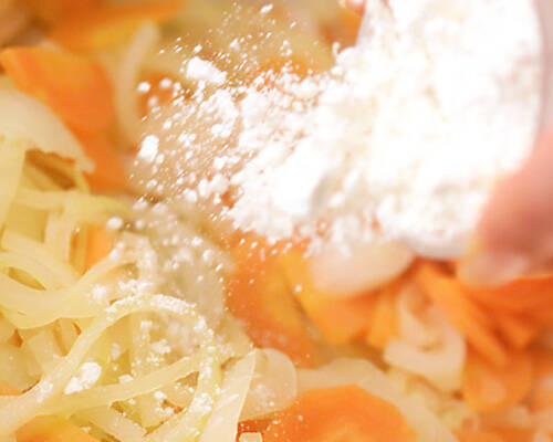 鍋にバターを入れて弱火にかけ、玉ネギ、ニンジンを炒める。全体がしんなりしてくれば火を止め、小麦粉を加えて全体にからめるように混ぜ合わせる。再び弱火にかけ、粉っぽさがなくなったら、固形ブイヨン、水、クリームコーン缶を加える。