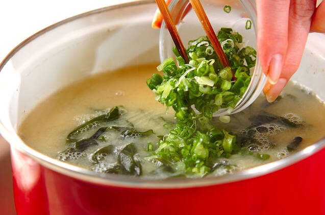 豆腐を加えて再び煮立つ直前に火を止め、ワカメ、刻みネギを加え、器に注ぎ分ける。