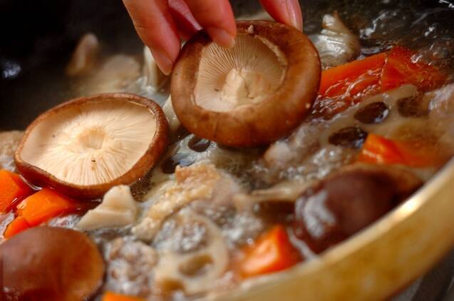 砂糖を加えて5分煮て、火を強めてシイタケ、しょうゆを加える。