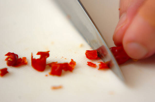 セリは3cmの長さに切り、茎と葉先の部分に分けておく。ニンニクはみじん切りにし、赤唐辛子は軽く種を取り、小口切りにする。