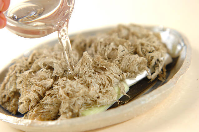 耐熱容器に昆布をしき、その上に白ネギを並べる。白ネギの上に(1)のカキを並べ、全体に酒をかける。