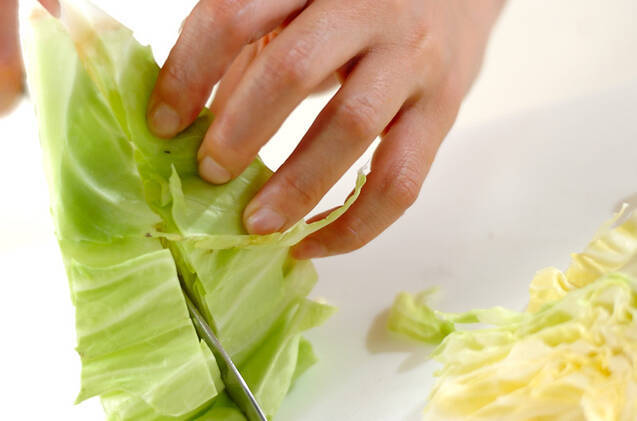 キャベツは軸を切り離さないように8つに切り分け、水洗いして水気をしっかりきる。