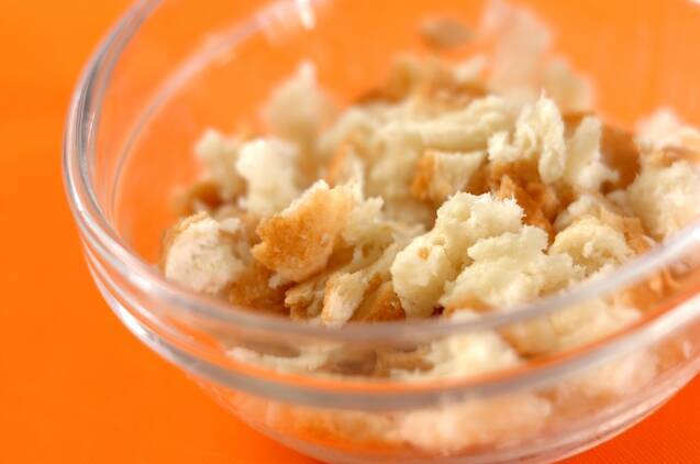 ジャガイモは皮をむき、4~6等分のくし切りにする。ニンジンは皮をむき、長さ3~4cmに切り、さらに縦3~4等分に切る。ブロッコリーは小房に分ける。ハムと玉ネギはみじん切にする。食パンは細かくちぎり、牛乳をしみ込ませる。蒸し器を火にかけておく。