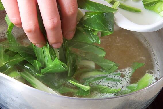 鍋に<スープ>の材料を入れて強火にかけ、チキンブイヨンが煮溶ければチンゲンサイ、白菜、ハムを加え、再び煮立てば金時ニンジンを加える。