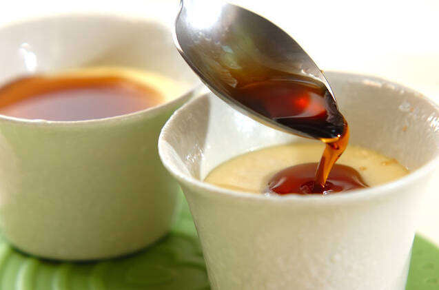 マグカップをそっと揺らし、全体にかたまっていたらOK。粗熱が取れたら冷蔵庫で冷やし、メープルシロップをかけてミントの葉を飾る。