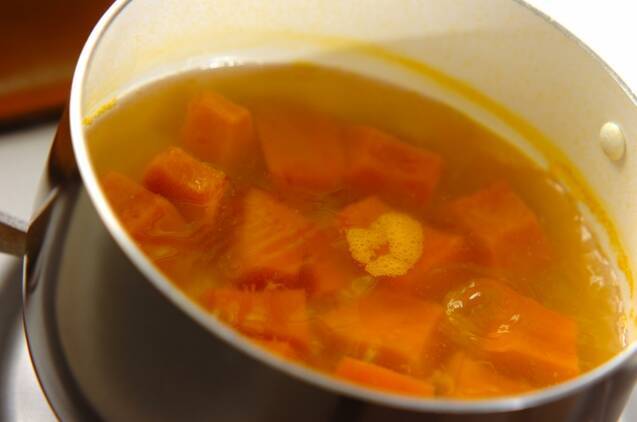 カボチャは種とワタを取り、皮をむいて2~3cm角に切る。鍋にカボチャとかぶるくらいの水を入れて、火が通るまでゆで、水気をきる。