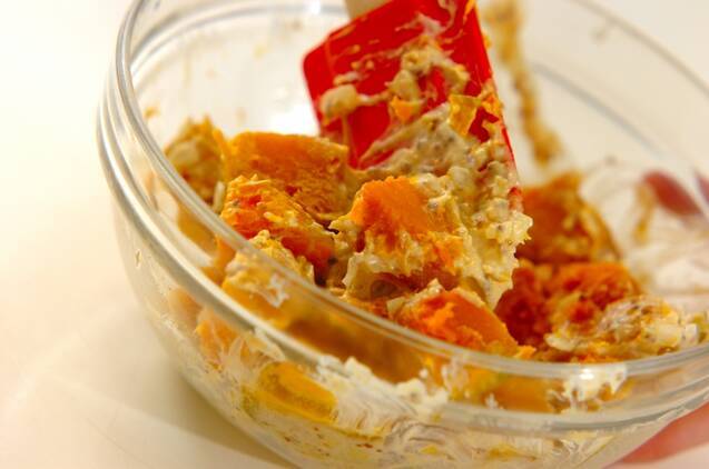 ボウルに<ドレッシング>の材料を混ぜ合わせ、カボチャを加え、和える。