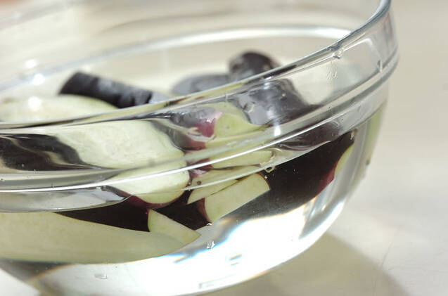 ナスはヘタを取り、縦1cm幅に切り、薄い塩水につけてアクをぬく。