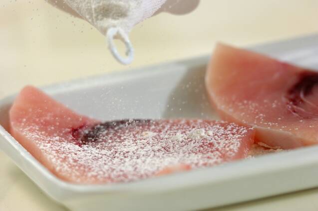 カジキはキッチンペーパ―で水気を拭き、塩を振って10分置く。水気が出てきたら拭き取り、 小麦粉を薄くまぶす。