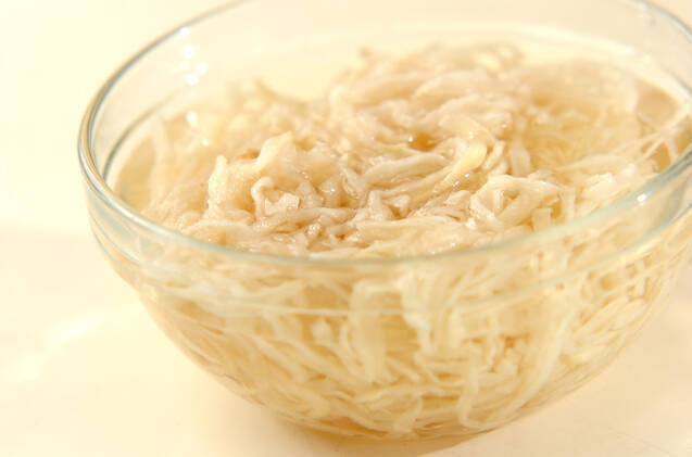 切干し大根はたっぷりの水で柔らかくもどし、水気を絞ってザク切りにする。