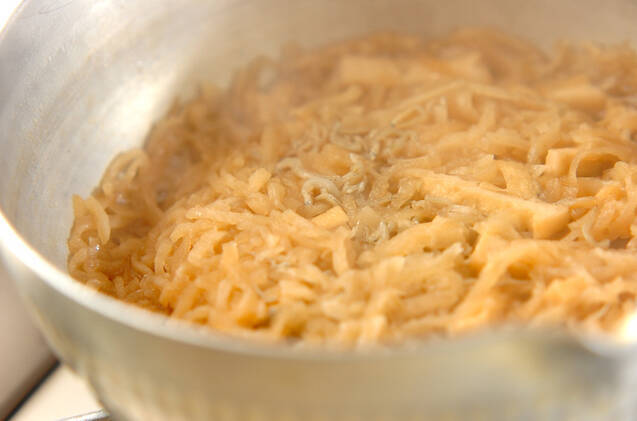 落とし蓋をし、煮汁がほとんどなくなるまで煮、器に盛る。(ヒント)多めに作った場合は、粗熱が取れたら保存容器に移し、冷蔵庫に入れておきましょう。3~4日は大丈夫です。作った翌日の方が、味が含んでおいしいですよ。お酒のおつまみにする場合は、煮る時に分量外の刻み赤唐辛子を加えるとピリッとおいしくなります。