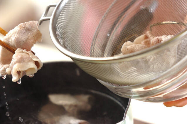 熱湯に豚肉を加えて菜ばしで大きく混ぜ、色が変わったらザルに上げる。