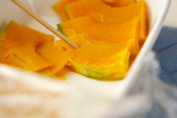 カボチャは、耐熱容器に入れてラップをかけ、電子レンジに4分かける。竹串を刺してス~ッと刺さればOK。電子レンジは600Wを使用しています。