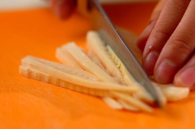 水煮タケノコは細切りにする。ブロッコリースプラウトは根元を切り落とし、水に放って水気をきる。<卵液>の卵を割りほぐす。