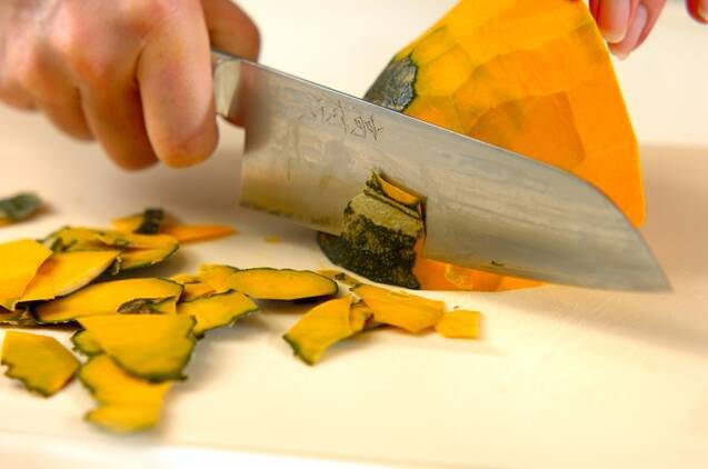カボチャは種とワタを取り、皮をむいて2cm角に切る。耐熱皿にのせラップをして電子レンジで2分程加熱し、熱いうちにつぶす。